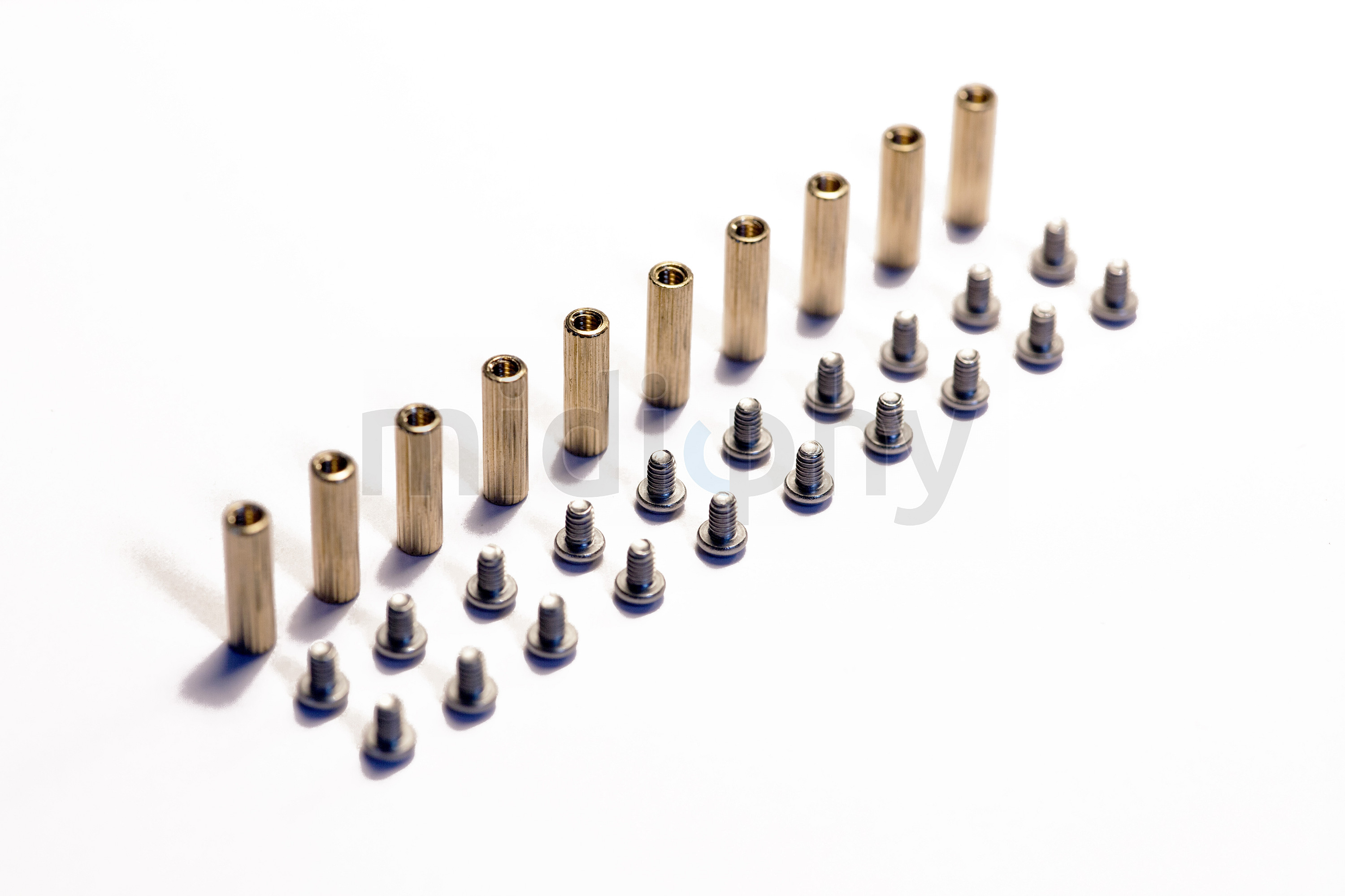 For assembling our Eurorack PCBs. Contents sufficient for all modules A1, D1, D2, D3. Kit contains 10 pcs M2 standoffs and 20 pcs M2 screws.
