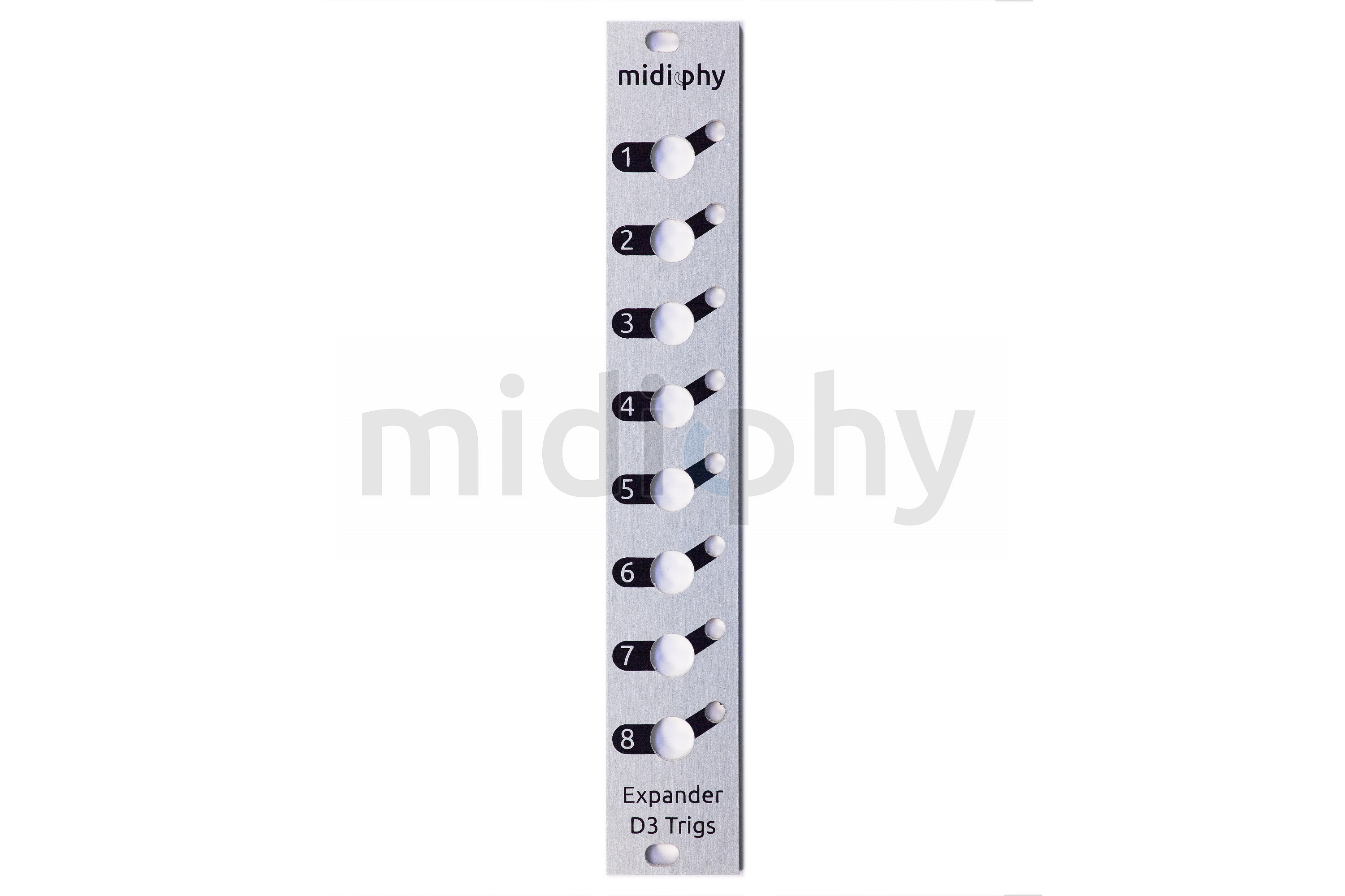 D3 Digital Expander "triggers" module frontpanel by Hallik Engineering. Natural aluminium with black silkscreen labels. 4HP.